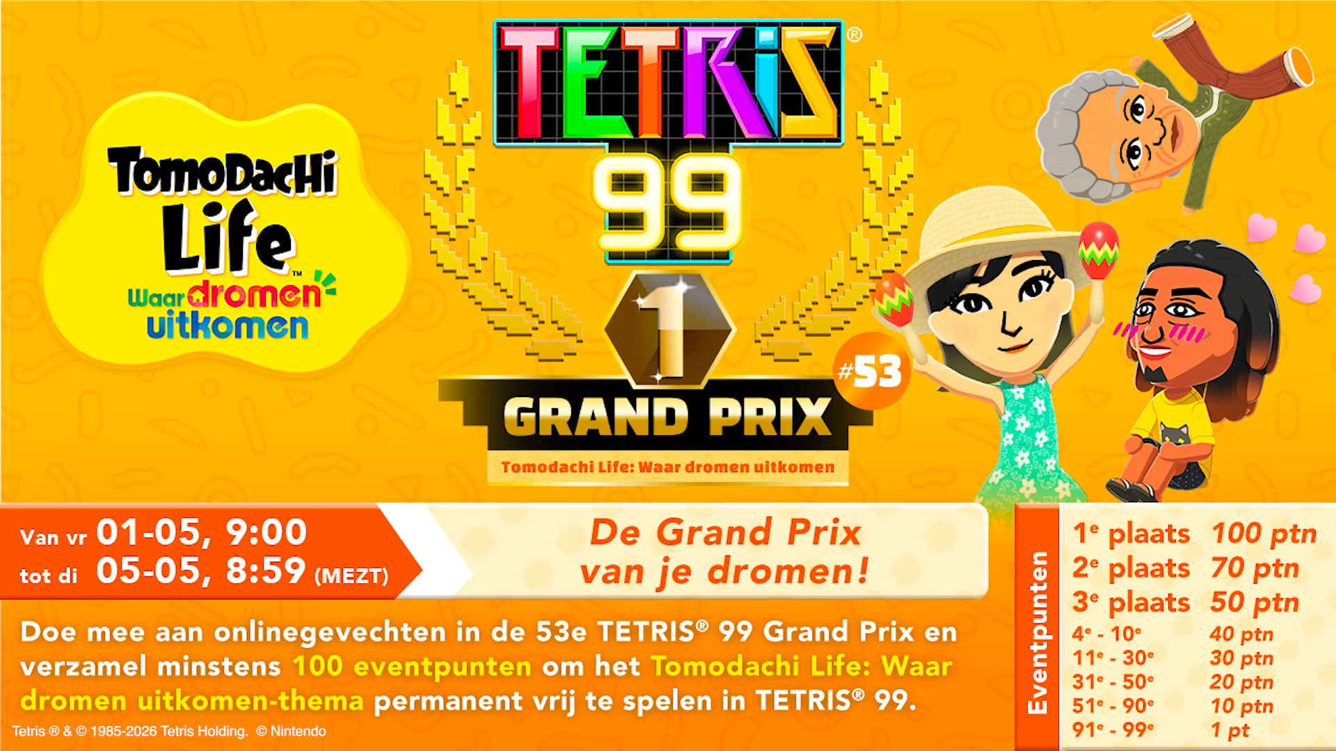 Wij en andere Tomodachi Life-fans zijn alweer bijna twee weken aan het genieten van Tomodachi Life: Waar dromen uitkomen. Als je maar geen genoeg krijgt van dit spel, maar wel even iets anders wilt doen, dan hebben we goed nieuws voor je. Vanaf aanstaande vrijdag, 1 mei, wordt er namelijk een Tomodachi Life-thema aan Tetris 99 toegevoegd! Door de trailer, die onderaan dit artikel te bekijken is, krijg je alvast een officiële blik op het thema, inclusief de muziek die op de achtergrond afspeelt.