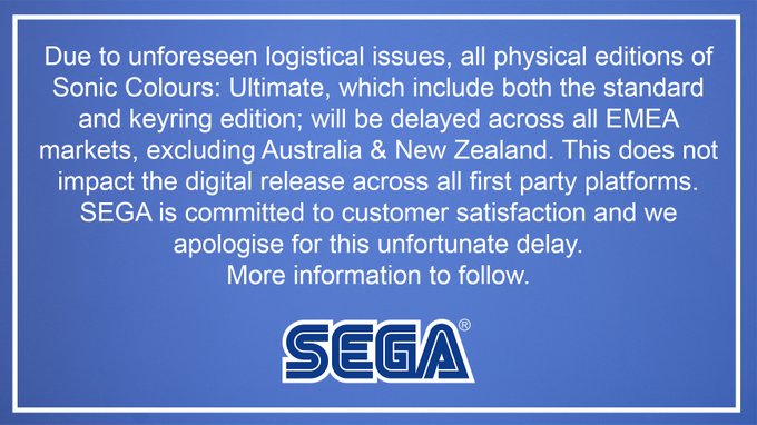 Eerder dit jaar werd een remake van Sonic Colours aangekondigd, welke begin volgende maand onder andere naar de Nintendo Switch zal komen. Sonic Colours: Ultimate zal zowel digitaal als fysiek verschijnen echter zullen we iets langer moeten wachten op de fysieke versie. SEGA heeft via een statement kenbaar gemaakt dat de fysieke versie van Sonic Colours: Ultimate wegens onvoorziene logistieke redenen uitgesteld is voor de EMEA-regio. Deze regio betreft Europa, het Midden-Oosten en Afrika. Het gaat hierbij zowel om de normale fysieke versie als de limited edition.