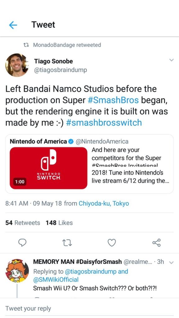 Tiago Sonobe werkte tussen april 2014 en augustus 2016 voor Bandai Namco als software engineer en programmer. Daarna verliet hij Bandai Namco en stapte hij over naar Nintendo. In een berichtje dat hij op Twitter heeft geplaatst zou hij zomaar eens onthult kunnen hebben dat Bandai Namco momenteel aan Super Smash Bros voor de Nintendo Switch werkt. In de Tweet, welke inmiddels samen met zijn account al is verwijderd, schreef hij dat hij Bandai Namco al had verlaten voordat de productie van Super Smash Bros is begonnen. Ondanks dat het bericht Inmiddels is verwijderd kun je deze hieronder nog wel terug zien. Vooralsnog is echter niets bevestigd en blijft het natuurlijk wel een gerucht.