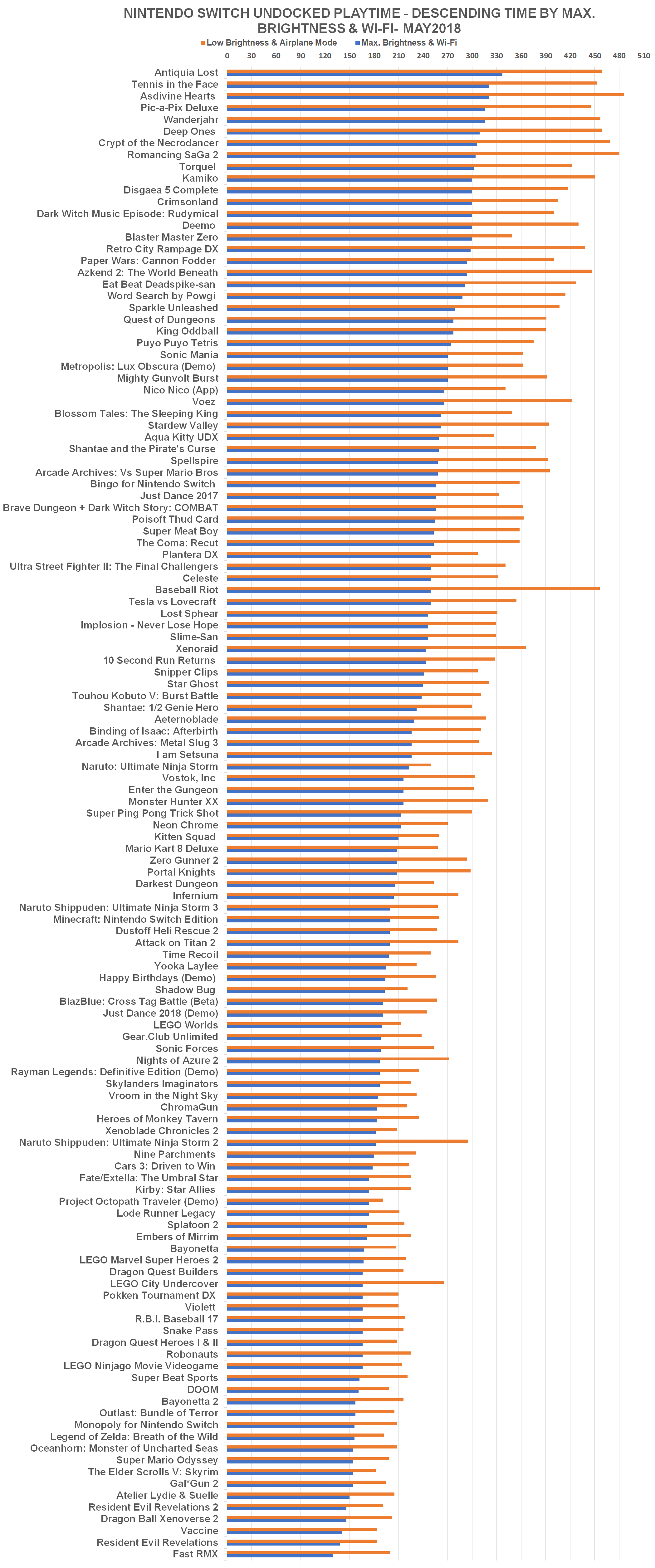 De rechtergrafiek laat dezelfde spellen zien maar dit keer is de lijst anders gesorteerd. Het spel dat nu bovenaan staat kan het langst gespeeld worden als de vliegtuigmodus wordt ingeschakeld en de helderheid zo laag mogelijk wordt gezet. We zien dat Asdivine Hearts met meer dan 8 uur hier het beste presteert. Onderaan staat Skyrim, wat net boven de 3 uur scoort. Een verschil van ruim 5 uur aan speeltijd dus!