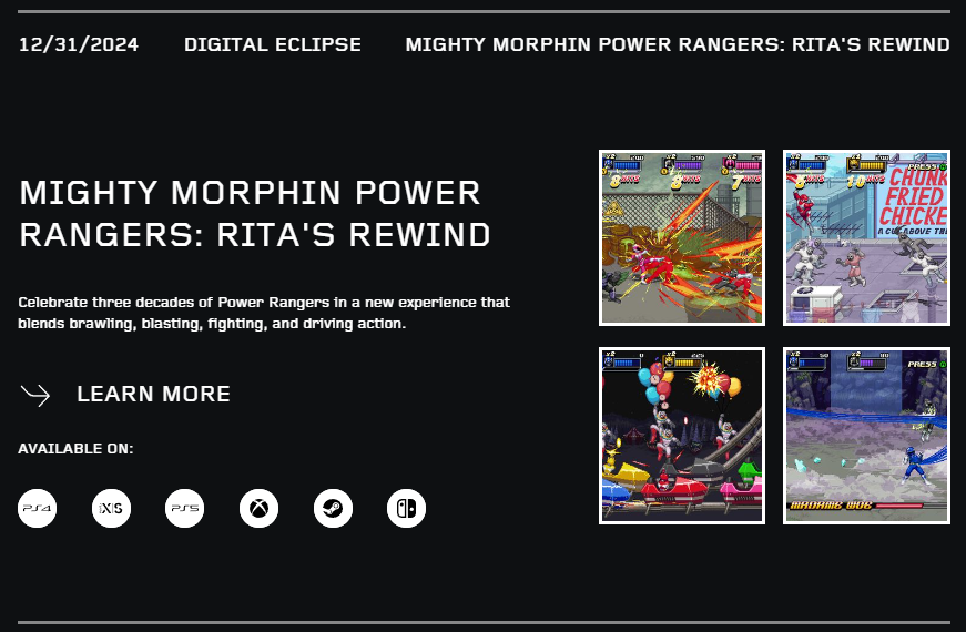 Maar zoals je ziet, worden er in de trailer geen consoles getoond. Er wordt alleen gemeld dat je de game kan wishlisten op Steam. Met een gebrek aan console-aankondigingen waren aardig wat fans teleurgesteld. Of op z’n minst in de war. Maar… er lijkt wat opheldering te zijn nu. De site van Digital Eclipse heeft namelijk de Nintendo Switch gewoon genoemd als console waar de game op te spelen valt.