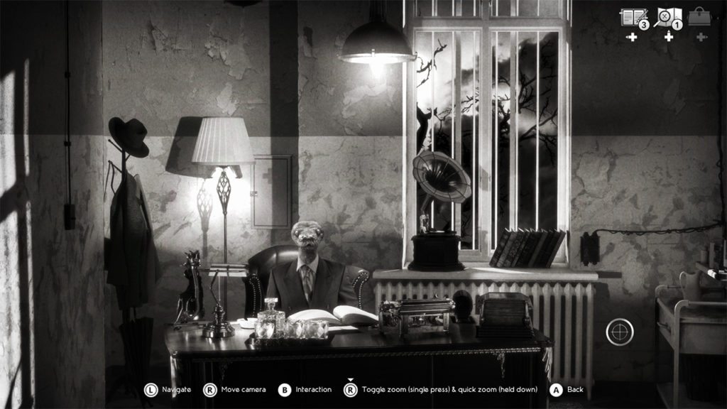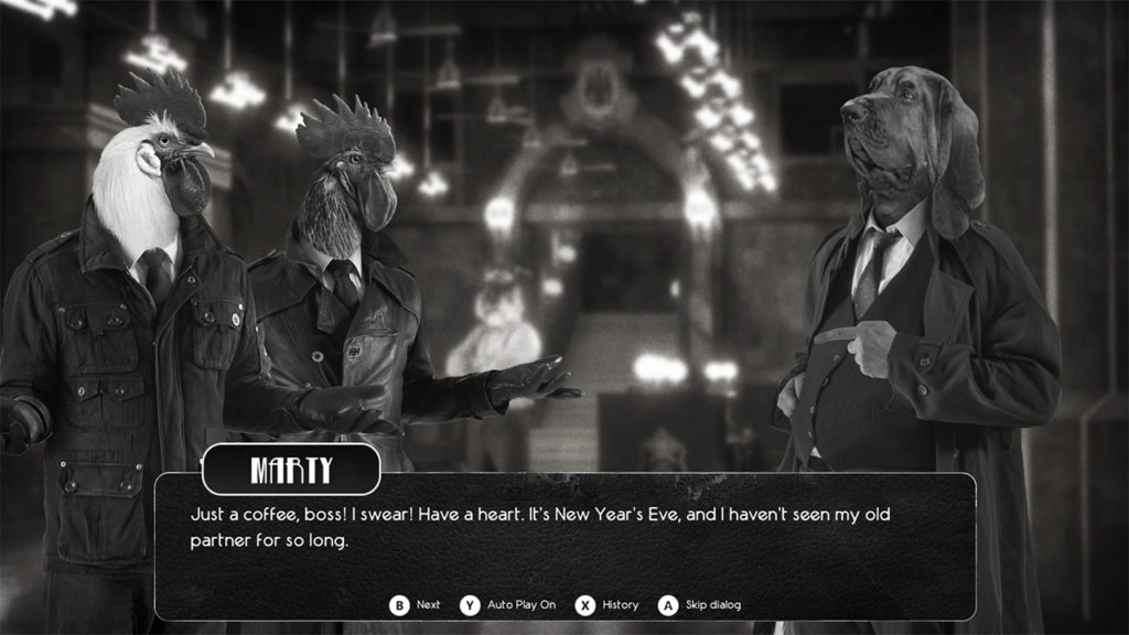 Tsja, het zijn natuurlijk om te beginnen al dierenhoofden op mensenlijven. Erg bijzonder, zeker samen met het feit dat de stad zijn kleur is verloren. Het spel komt erg duister en spannend over. Alle tekst heeft een voice-over, wat de personages veel karakter meegeeft. Dit maakt het spel wel echt af. Het viel ook gelijk op dat de tekst verschijnt op een ‘leatherlook’ achtergrond. Al deze details samen maken het spel bijzonder goed afgewerkt.