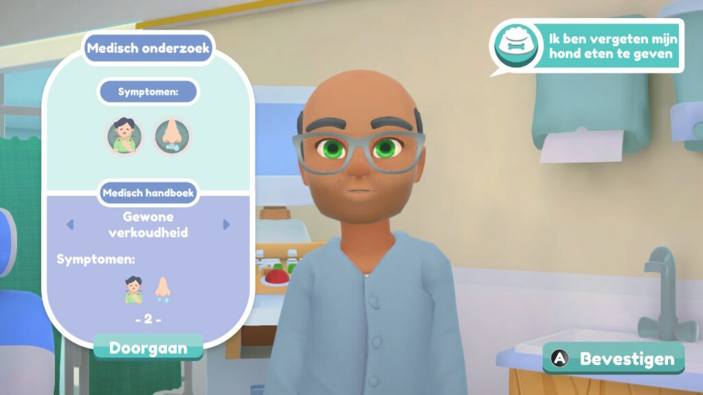 Wanneer je de game opstart kan je kiezen hoe de arts en verpleger eruitzien. Je hebt beperkte opties in wat je kan aanpassen: geslacht, haarkleur, huidskleur en accessoires. Ik had het wel leuk gevonden als je dit wat persoonlijker kon maken, zeker aangezien je het tijdens het spel niet meer kan aanpassen. Een goede optie had bijvoorbeeld het geven van een naam aan de personages kunnen zijn. Nu is het zo dat de game dat voor jou bepaalt. Hierna begint het spel echt.