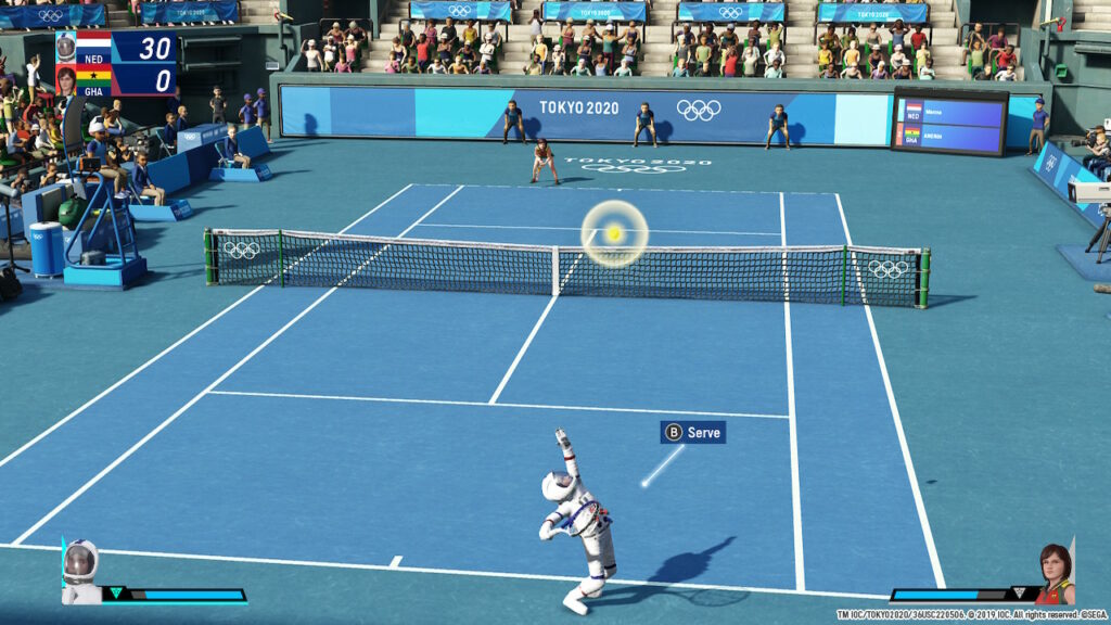 Wat mij meteen opviel is dat niet alle aspecten van Olympic Games Tokyo 2020 The Official Video even scherp zijn, maar dat betekent echt niet dat het er slecht uitziet. Ja, het publiek dat op de tribunes zit is nogal driehoekig, maar de game draait daardoor wel enorm soepel en heb ik helemaal geen last gehad van enige vertragingen of haperingen. Bovendien vind ik de stijl van alle speelbare personages, en het spel in het algemeen, er erg leuk uitzien. Het is niet super realistisch, maar toch zijn er wel overal leuke details te vinden. Zo staan er vele fotografen en cameramannen- en vrouwen naast het veld en hangen er bijvoorbeeld vlaggen van de desbetreffende landen die spelen op de tribunes.