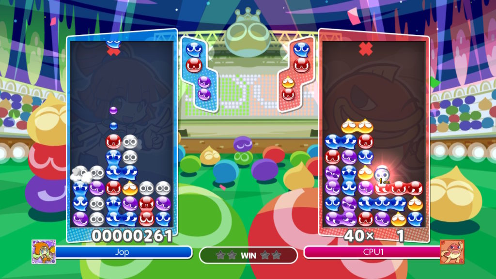 Net als bij het veel bekendere Tetris win je namelijk als de Puyo’s op het scherm van je tegenstander de bovenkant van het scherm bereikt hebben. Vanzelfsprekend verlies je wanneer jouw Puyo’s aan de top komen.