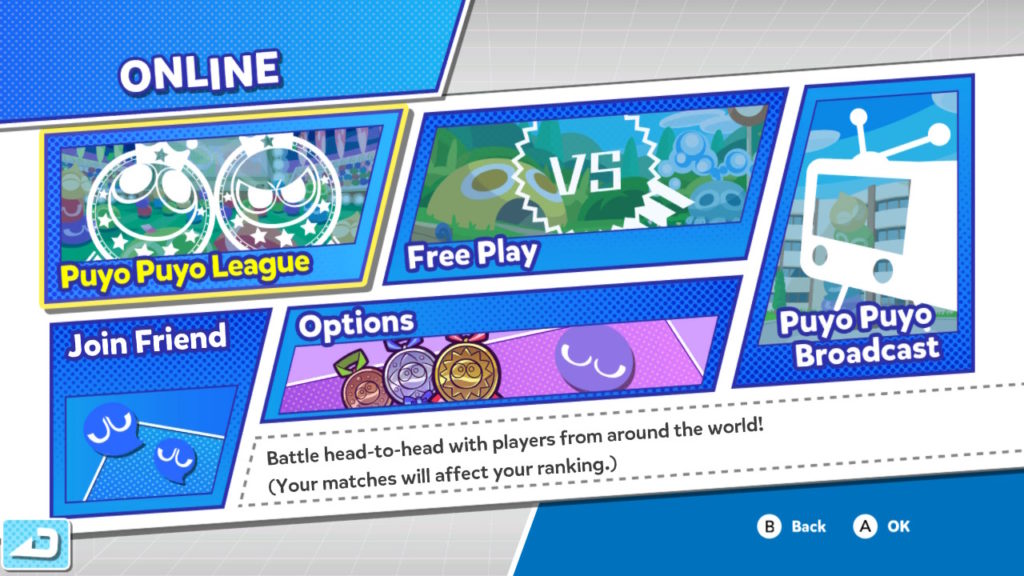 Dit is echter niet de focus van Puyo Puyo Champions. Uit alles wordt duidelijk dat dit spel zich met name op het online gedeelte richt. Wanneer je online gaat kan je kiezen uit twee opties. Je kan gaan voor de Puyo Puyo League waarin je score bijgehouden wordt en je tegen spelers van hetzelfde niveau speelt of je gaat voor Free Play. Bij die laatste zal je scoren niet zakken of stijgen na een potje en speel je ook tegen geheel willekeurige tegenstanders. Geen stress dus als je hier een potje verliest.