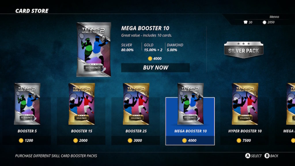 Omdat Tennis World Tour 2 niet zo’n hele spannende titel is hebben de makers ervoor gekozen om in deze titel iets nieuws toe te voegen, namelijk Skill Cards. Deze kaartjes kun je op elk gewenst moment in de winkel kopen met in-game munten, welke je krijgt door verschillende tennistoernooien te winnen. De kaartjes die je uit de verpakking gaat krijgen is een verrassing. Dit zorgt enigszins voor een spanningselement, wat best wel leuk is. Zelf merkte ik alleen dat ik die kaartjes vrijwel niet gebruik. Dit komt ten eerste omdat je tijdens het tennissen de verschillende kaartjes moet selecteren, maar tegelijkertijd moet je natuurlijk ook blijven tennissen. Tevens weet je bij de eerste paar pakjes ook nog niet wat de verschillende kaartjes precies doen. Tijdens het selecteren komt de uitleg van de geselecteerde kaart wel naar boven, maar het blijft erg lastig om deze te lezen terwijl je ook nog op tijd de tennisbal moet raken. Iets wat het tennissen dus makkelijker zou moeten maken, maakt het juist moeilijker. Toch kan ik het me zeker indenken dat je na verloop van tijd weet wat alle kaartjes doen, waardoor ze dus best handig kunnen zijn. Toch zul je dat zeker in het begin nog echt niet weten.
