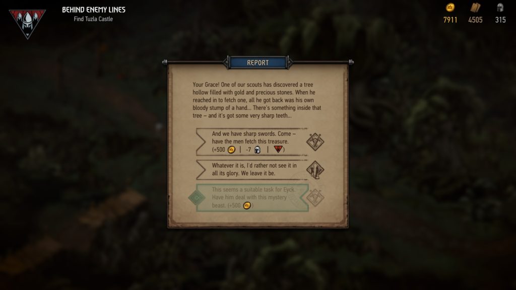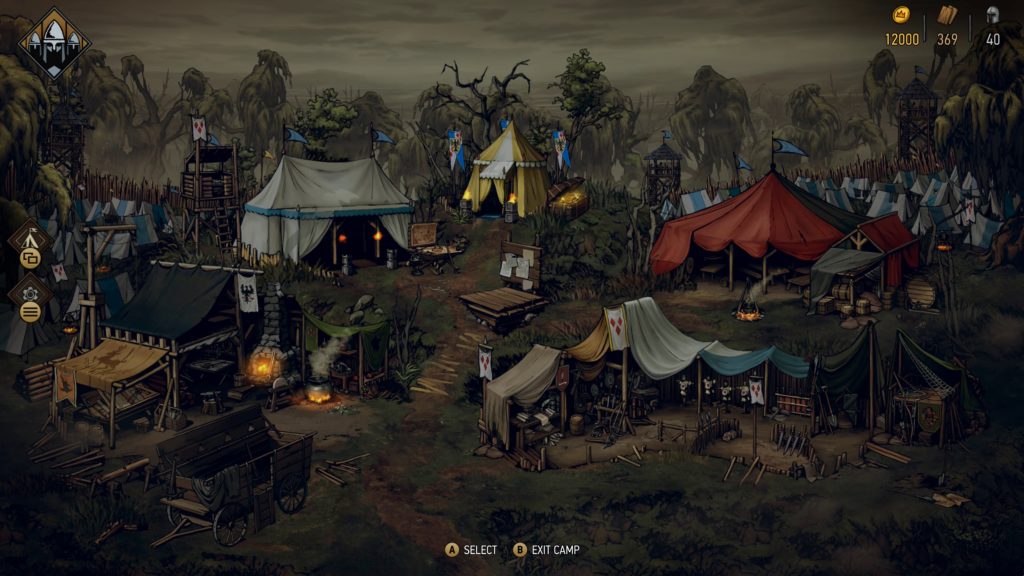 Thronebreaker: The Witcher Tales is dus eigenlijk vooral een card-game, maar gelukkig is dat niet alles. Het Gwent deck moet namelijk het leger van Meve voorstellen (waarbij personages dus echt worden neergezet als speciale kaarten) en je zult dan ook tijd moeten steken in het onderhouden en uitbreiden van dit leger. Als je niet in een gevecht zit, loop je dan ook rond op grote wereldkaart, waar je resources verzamelt en naar je onderdanen in het land luistert. De resources bestaan uit hout, goud en mankrachten, en je gebruikt deze letterlijk om een kamp mee op te bouwen. Tijdens het uitbreiden van dit kamp speel je namelijk nieuwe kaarten vrij, die je daarna in je deck zult kunnen gebruiken. Ook krijg je op deze manier kleine bonussen, waarmee je bijvoorbeeld makkelijker geld verdient of Meve sneller laat lopen op de wereldmap.