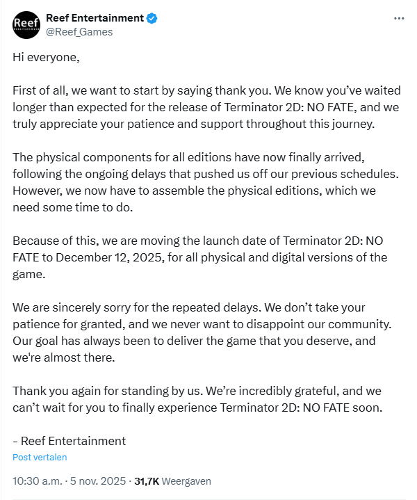 Begin dit jaar is Terminator 2D: No Fate aangekondigd, een action-side scroller die als hommage dient aan Terminator 2. Zo speel je bijvoorbeeld als Sarah Conner en de T-800 terwijl jullie proberen de plannen van Skynet tegen te houden. Met de aankondiging werd meteen een releasedatum gegeven, maar deze is inmiddels verschillende keren uitgesteld. Het laatste nieuws was dat de game op 26 november zou verschijnen, maar uitgever Reef Entertainment heeft laten weten dat het ook deze datum niet gaat halen. Dit in verband met de fysieke versies van de game. Een nieuwe releasedatum is wel meteen gegeven, de game staat nu gepland voor 12 december.